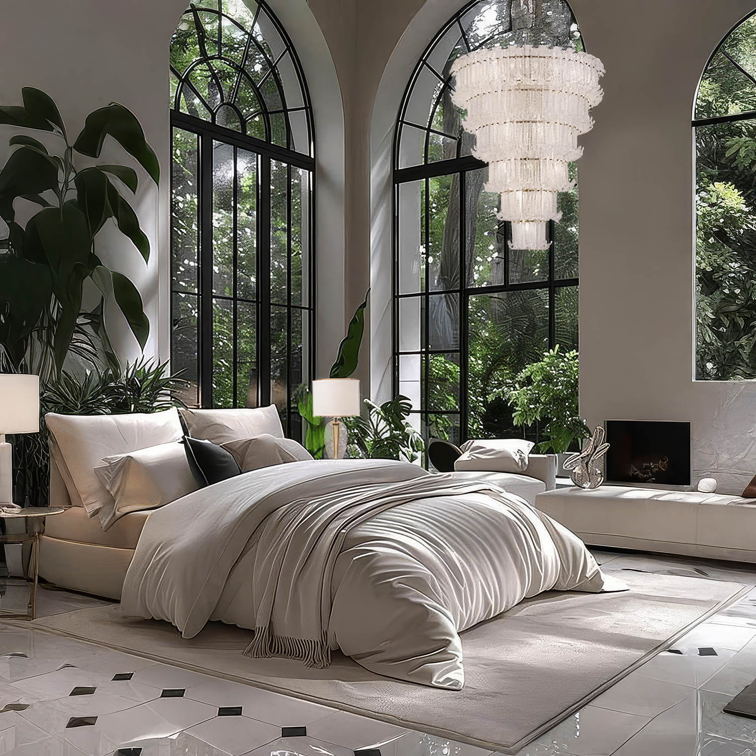 Серия TROPICANA включает люстры разных размеров и ярусов, компактные потолочные светильники, линейные модели и бра. Их строгая симметрия и ритмичное расположение элементов делают коллекцию универсальной для жилых и общественных интерьеров — от камерных спален до просторных холлов. Эти светильники становятся выразительным декоративным центром, привнося в пространство атмосферу тропического изящества и природной динамики.