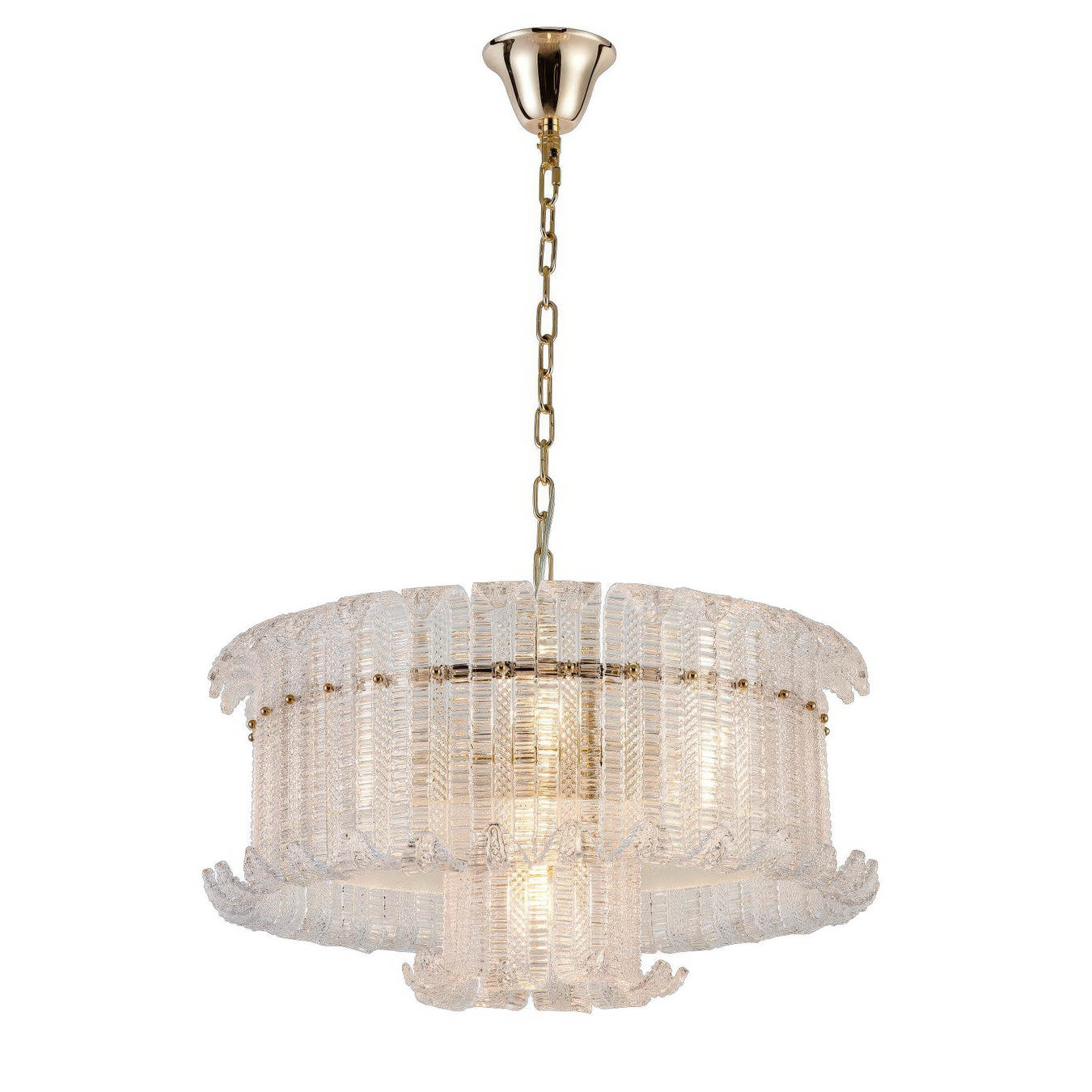 Каркас светильников выполнен из металла в светлом платиновом оттенке, подчёркивающим чистоту и гармонию формы. Плафоны из прозрачного стекла ручной работы обладают тонкой, многослойной фактурой, которая обеспечивает равномерное и мягкое рассеивание света, создавая ощущение лёгкости и воздушности.
