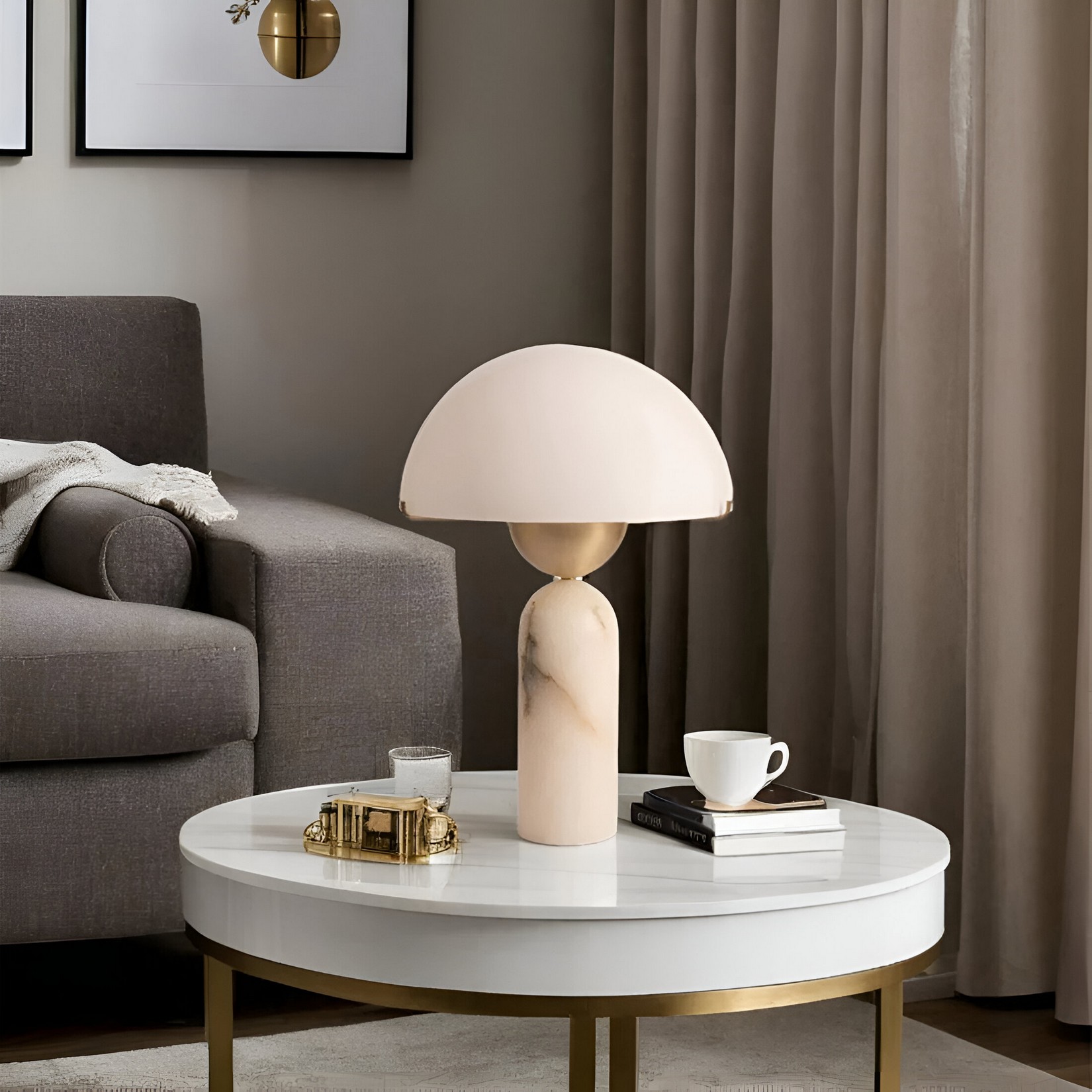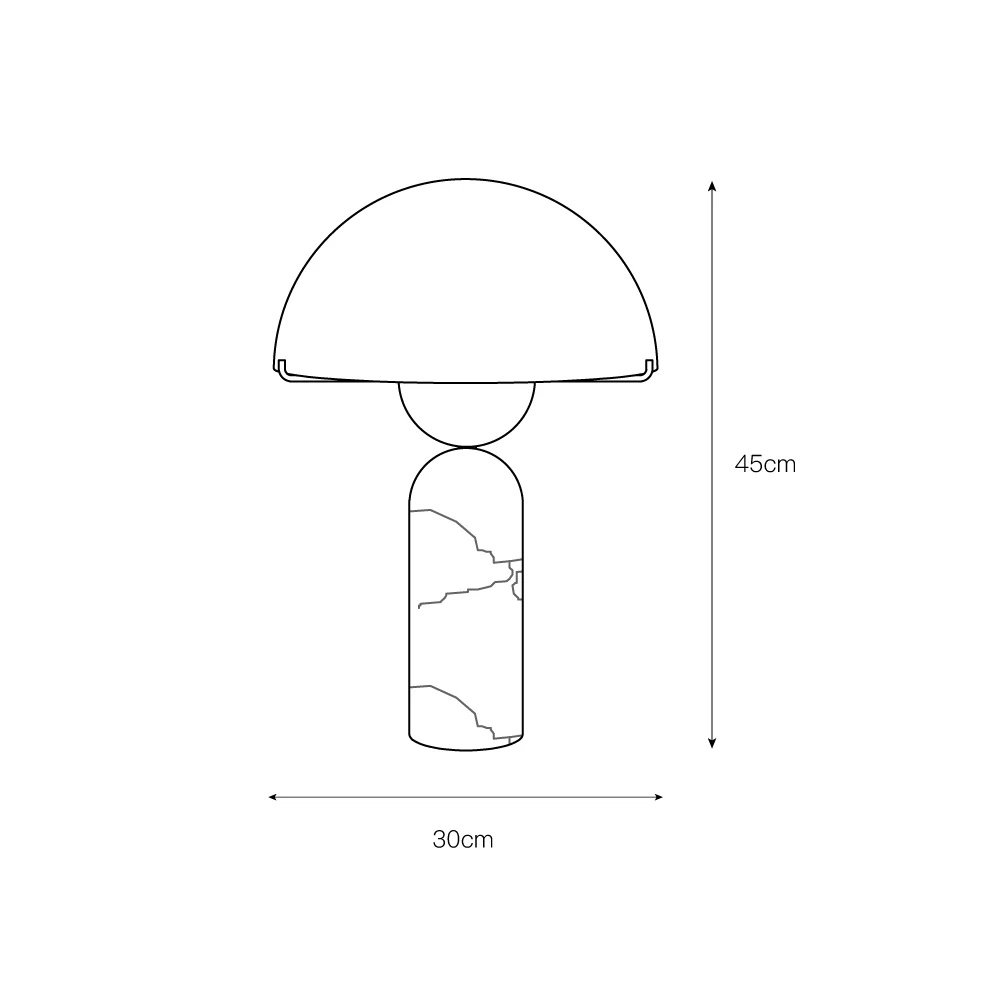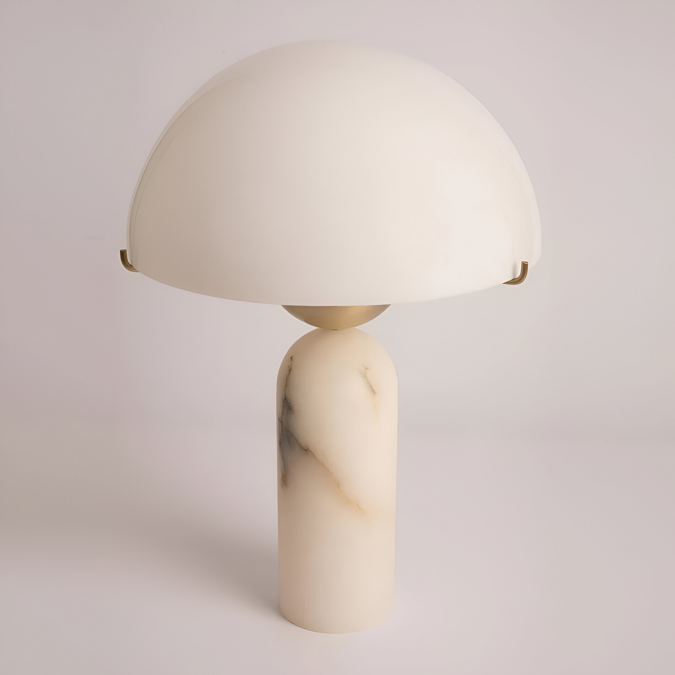 Настольная лампа, в которой алебастровый абажур-купол мягко рассеивает свет, создавая ровное теплое свечение. Цилиндрическое основание из того же натурального камня добавляет композиции строгость и баланс. Природные прожилки алебастра образуют живую текстуру, меняющуюся при разном освещении. Лаконичные золотистые детали подчеркивают современный характер светильника.