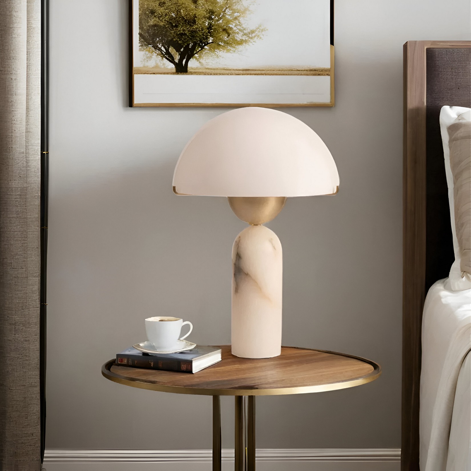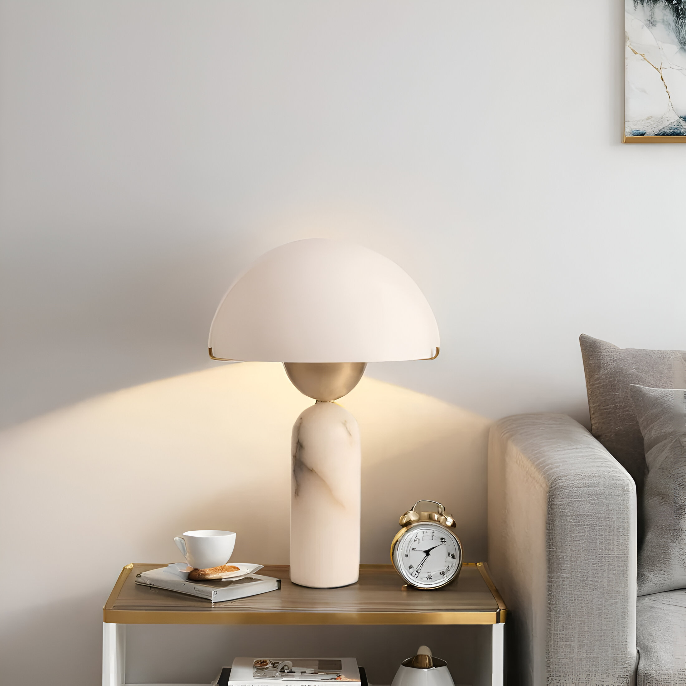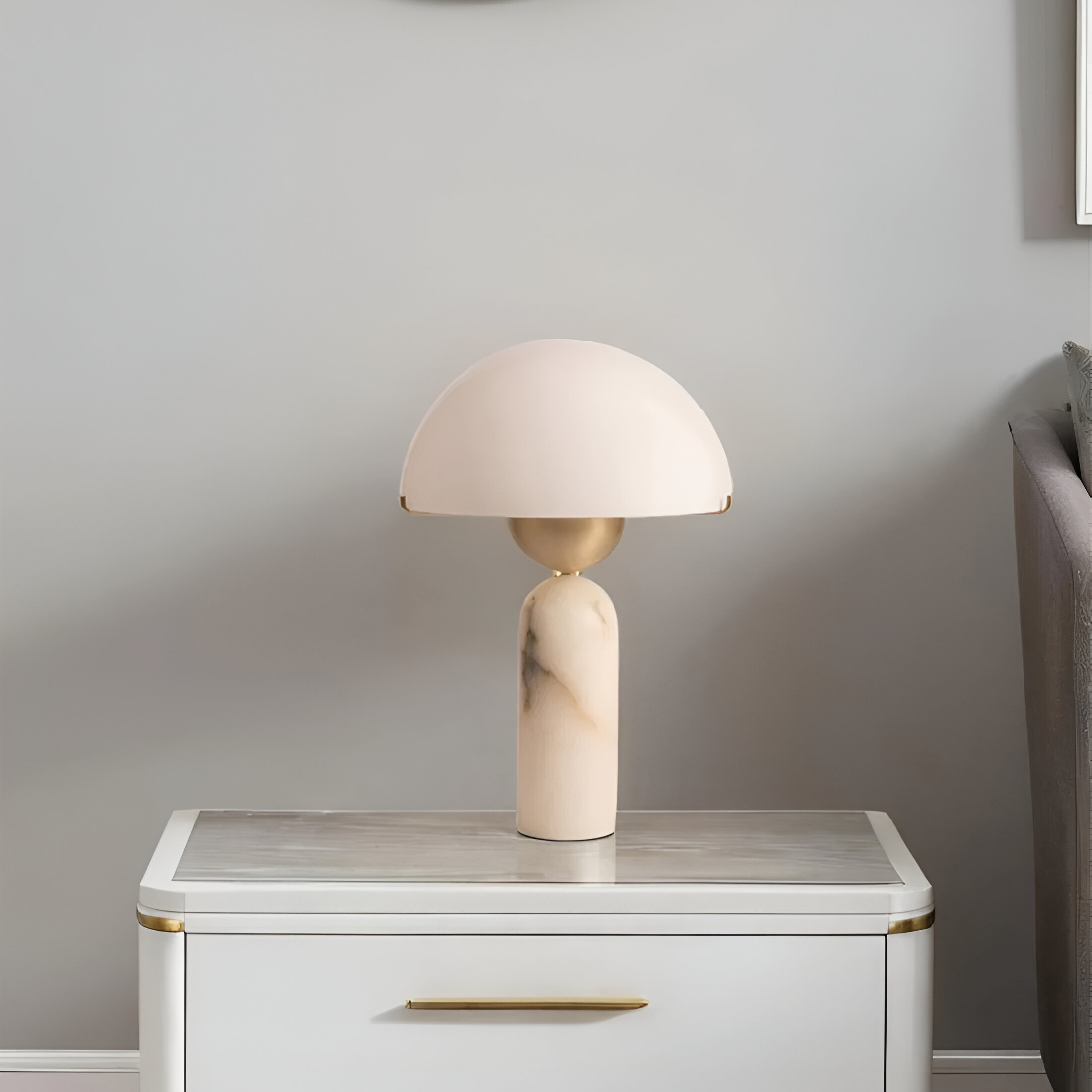 Настольная лампа, в которой алебастровый абажур-купол мягко рассеивает свет, создавая ровное теплое свечение. Цилиндрическое основание из того же натурального камня добавляет композиции строгость и баланс. Природные прожилки алебастра образуют живую текстуру, меняющуюся при разном освещении. Лаконичные золотистые детали подчеркивают современный характер светильника.