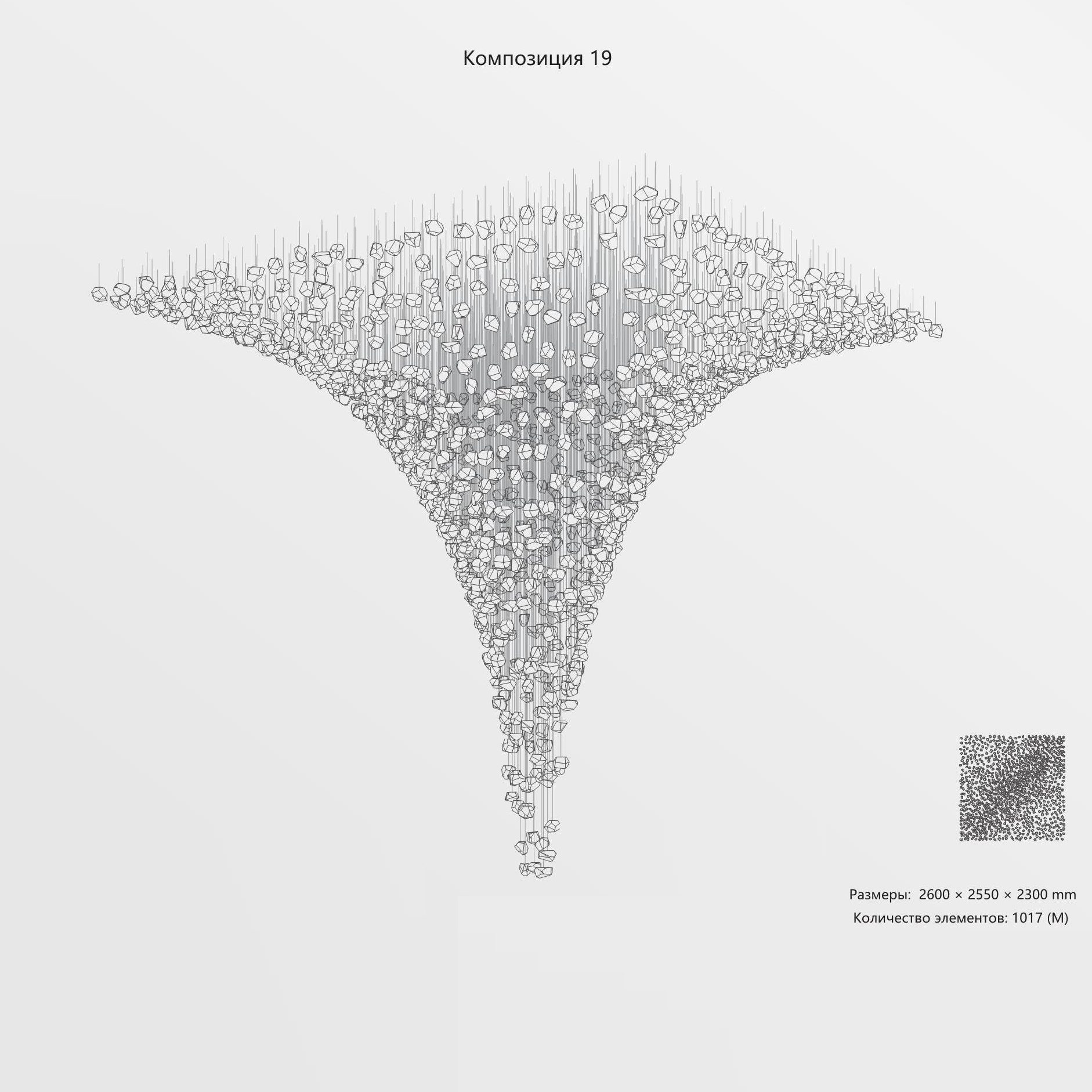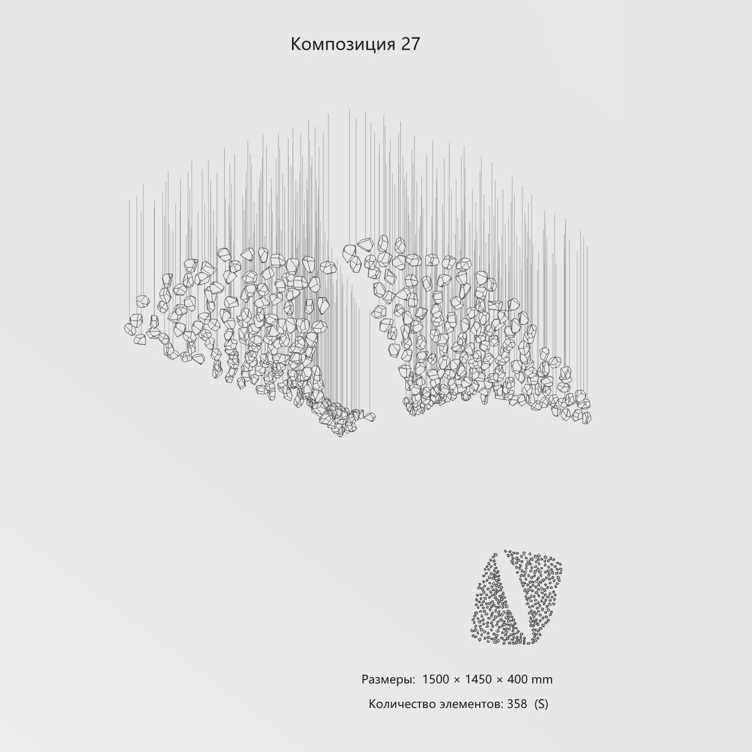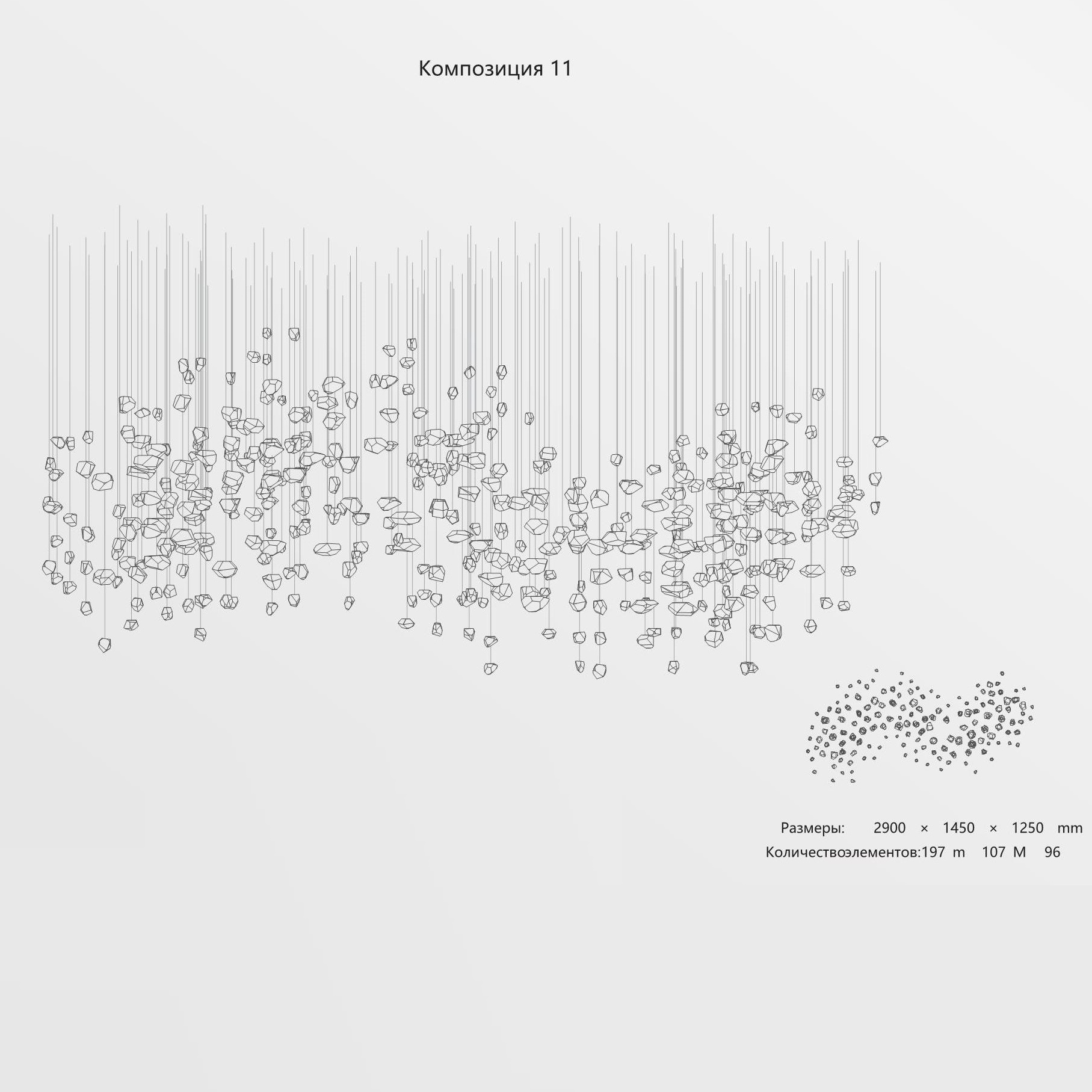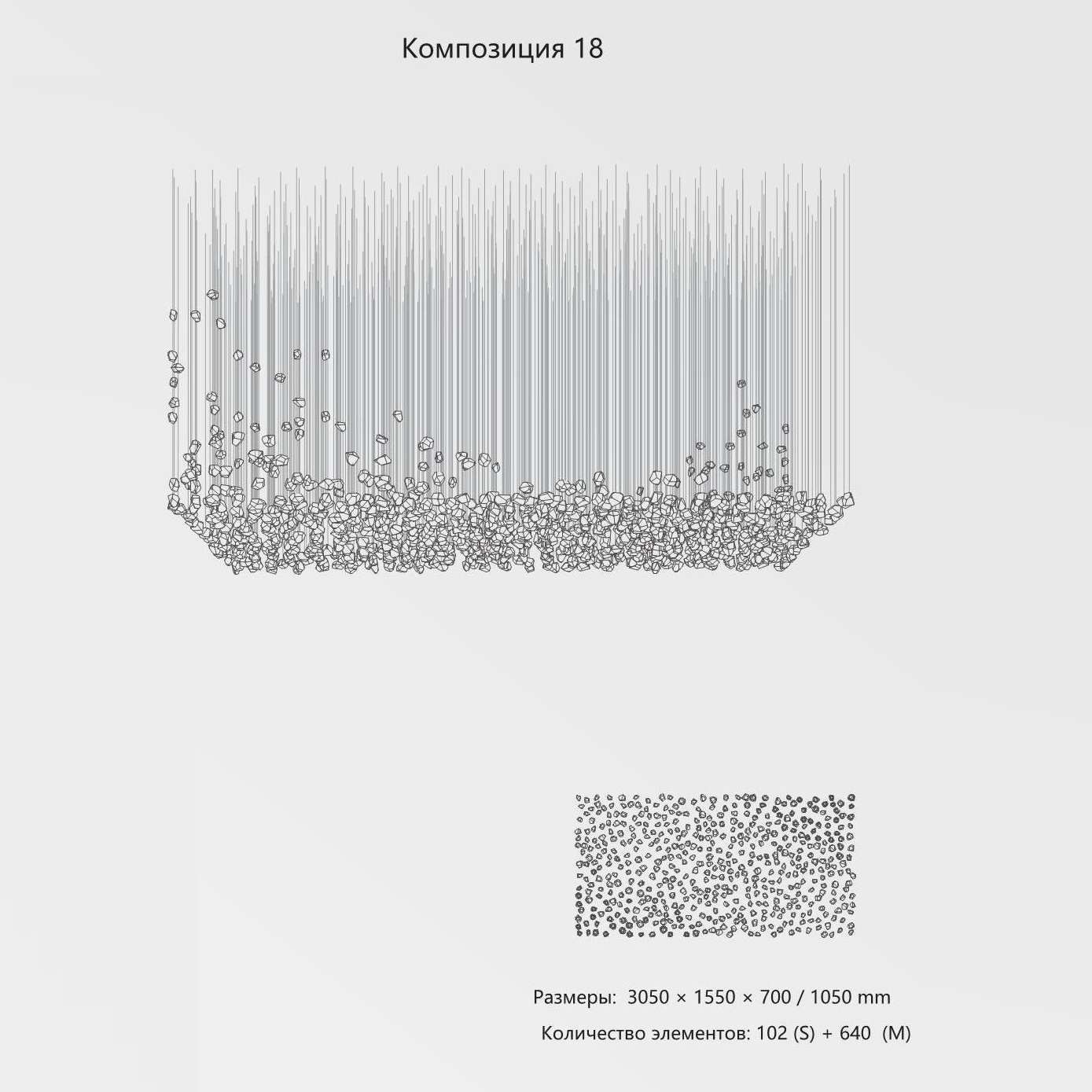 Конструкция представляет собой композицию из выразительных элементов, где каждый «камень» обладает уникальным рельефом и оптическими свойствами. Инсталляция доступна в трёх размерах элементов (S, M, L) и более чем в 35 готовых конфигурациях. Палитра включает классические прозрачные и дымчатые оттенки, а также насыщенные цветные варианты. При необходимости возможно создание индивидуального решения под конкретный проект.