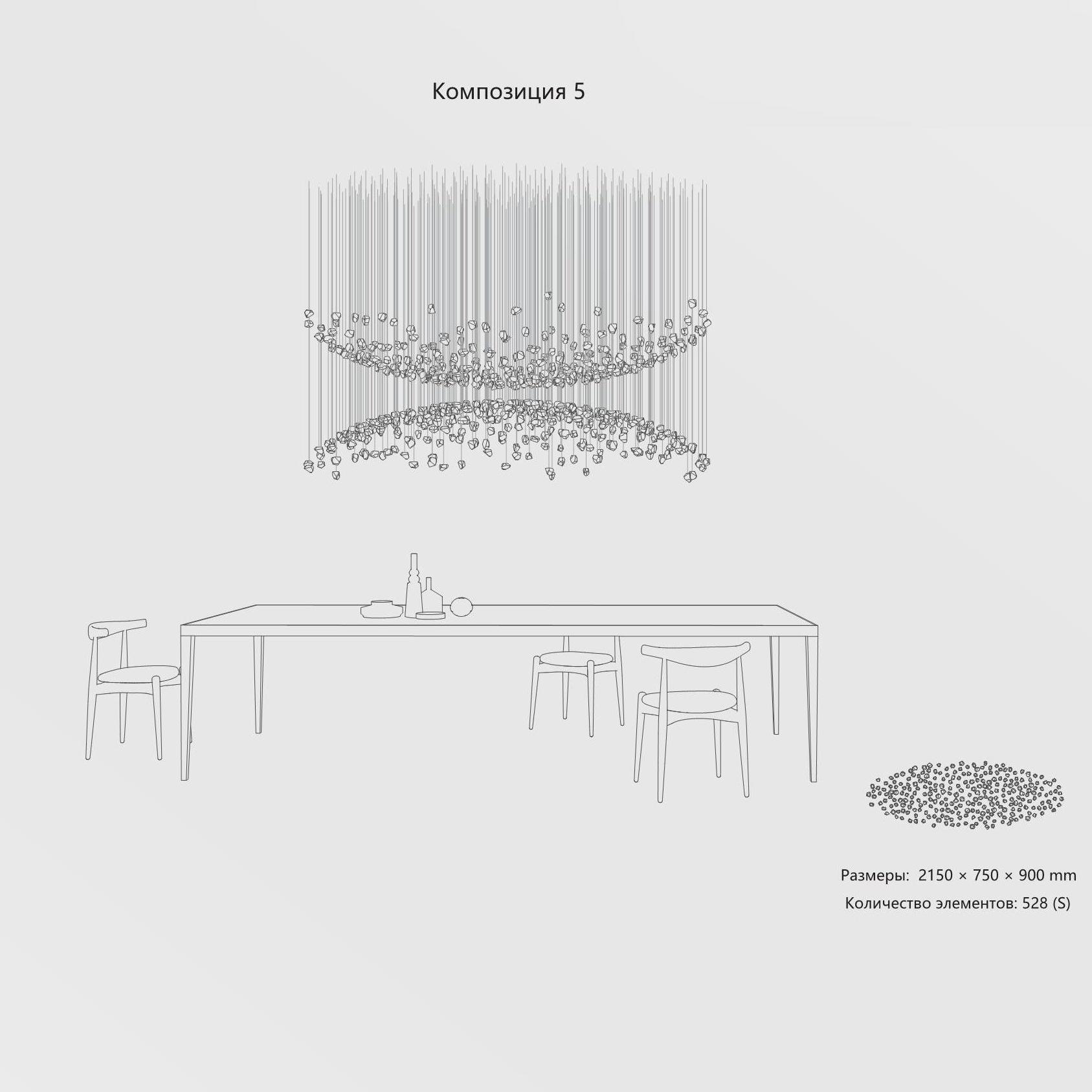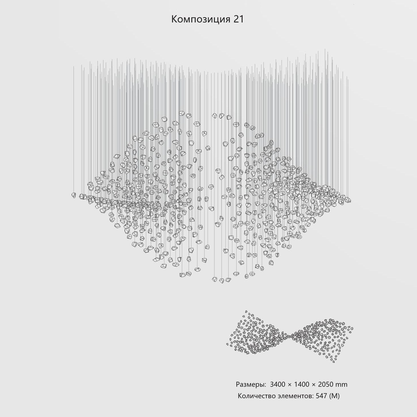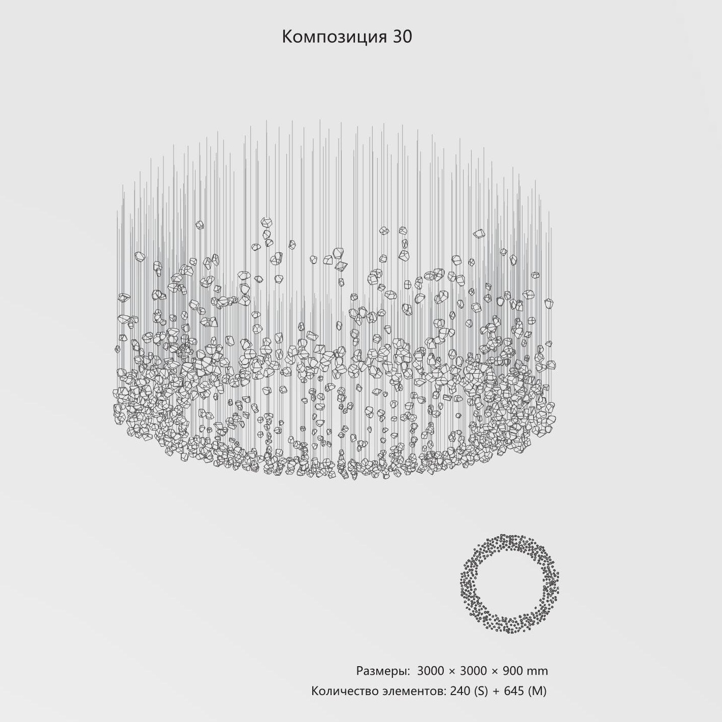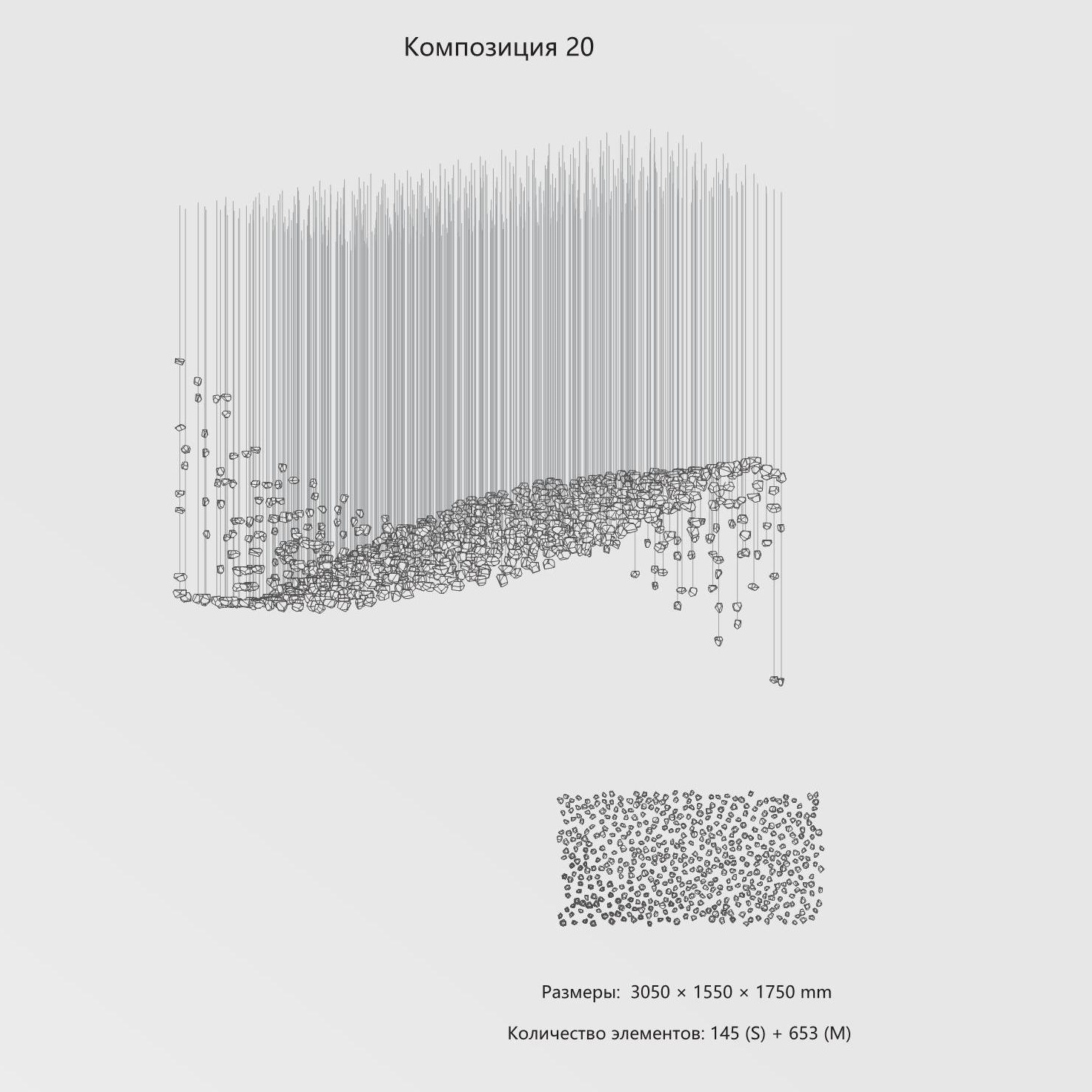 Конструкция представляет собой композицию из выразительных элементов, где каждый «камень» обладает уникальным рельефом и оптическими свойствами. Инсталляция доступна в трёх размерах элементов (S, M, L) и более чем в 35 готовых конфигурациях. Палитра включает классические прозрачные и дымчатые оттенки, а также насыщенные цветные варианты. При необходимости возможно создание индивидуального решения под конкретный проект.