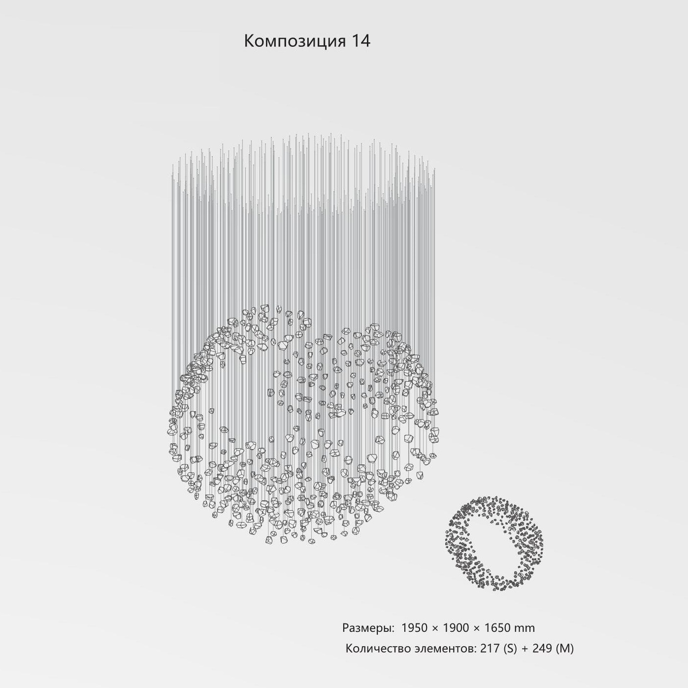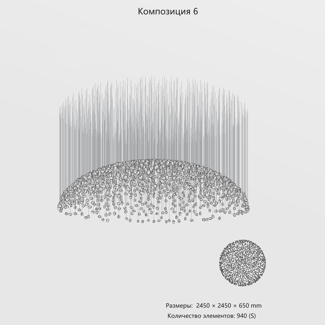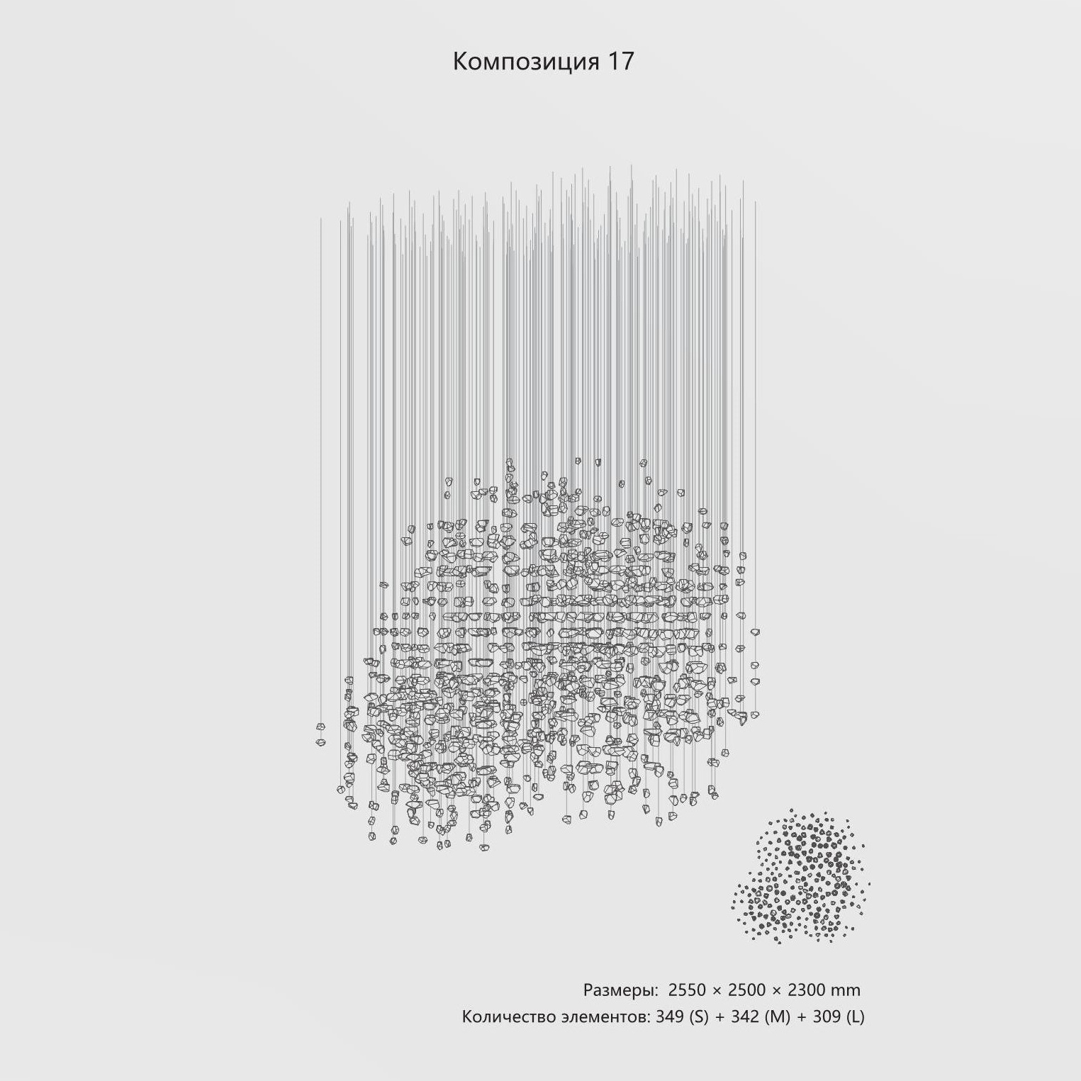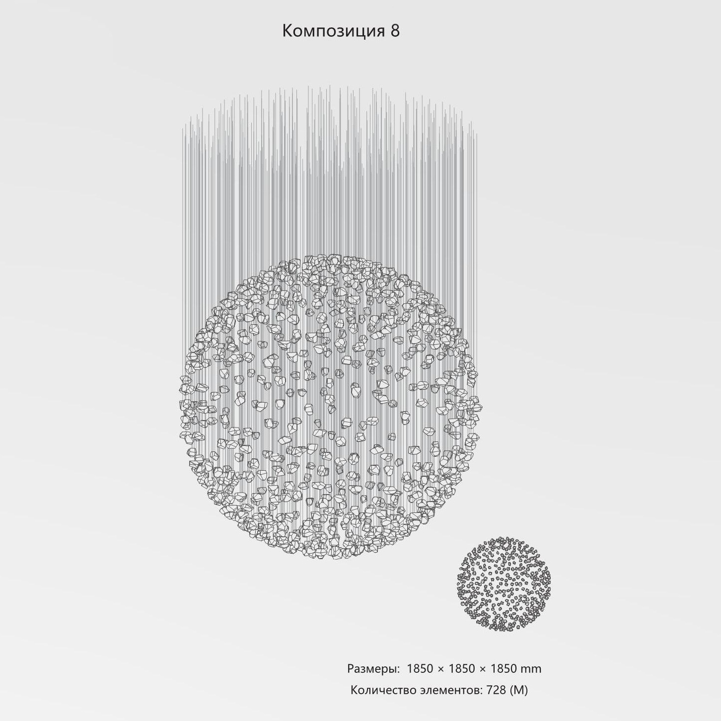 Конструкция представляет собой композицию из выразительных элементов, где каждый «камень» обладает уникальным рельефом и оптическими свойствами. Инсталляция доступна в трёх размерах элементов (S, M, L) и более чем в 35 готовых конфигурациях. Палитра включает классические прозрачные и дымчатые оттенки, а также насыщенные цветные варианты. При необходимости возможно создание индивидуального решения под конкретный проект.