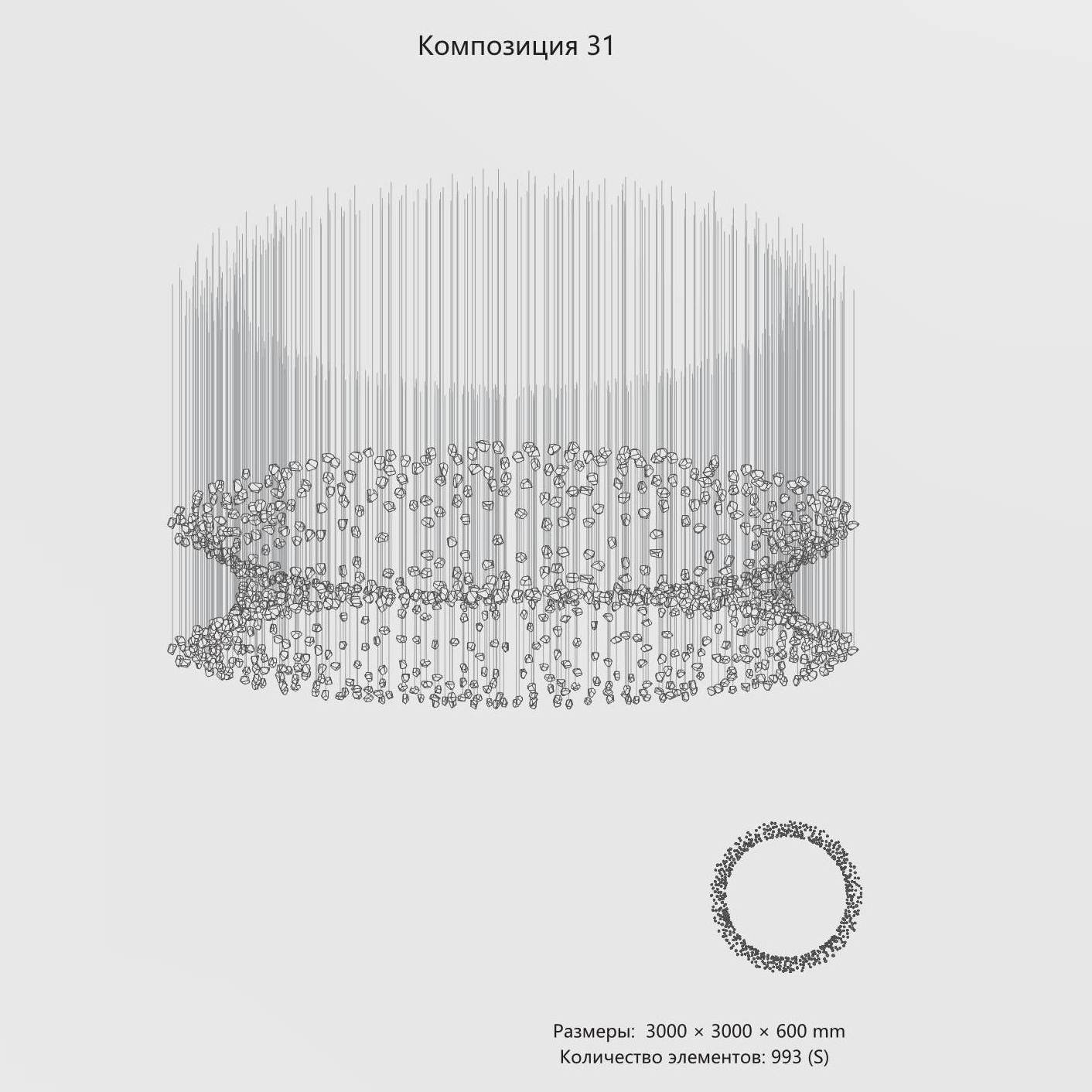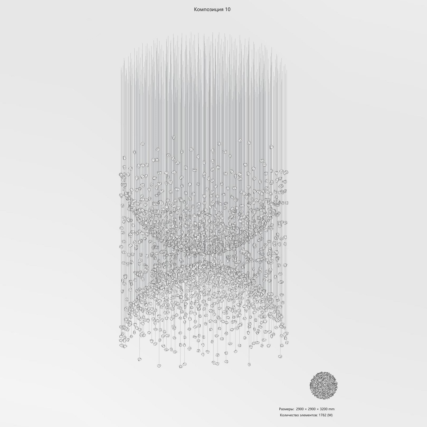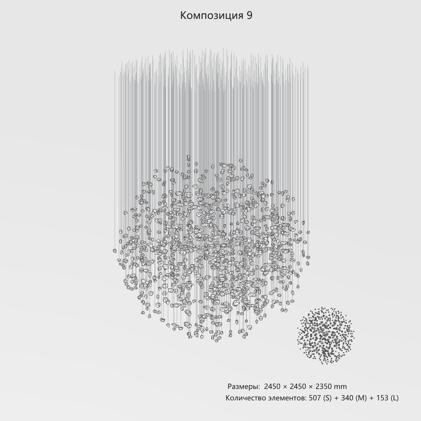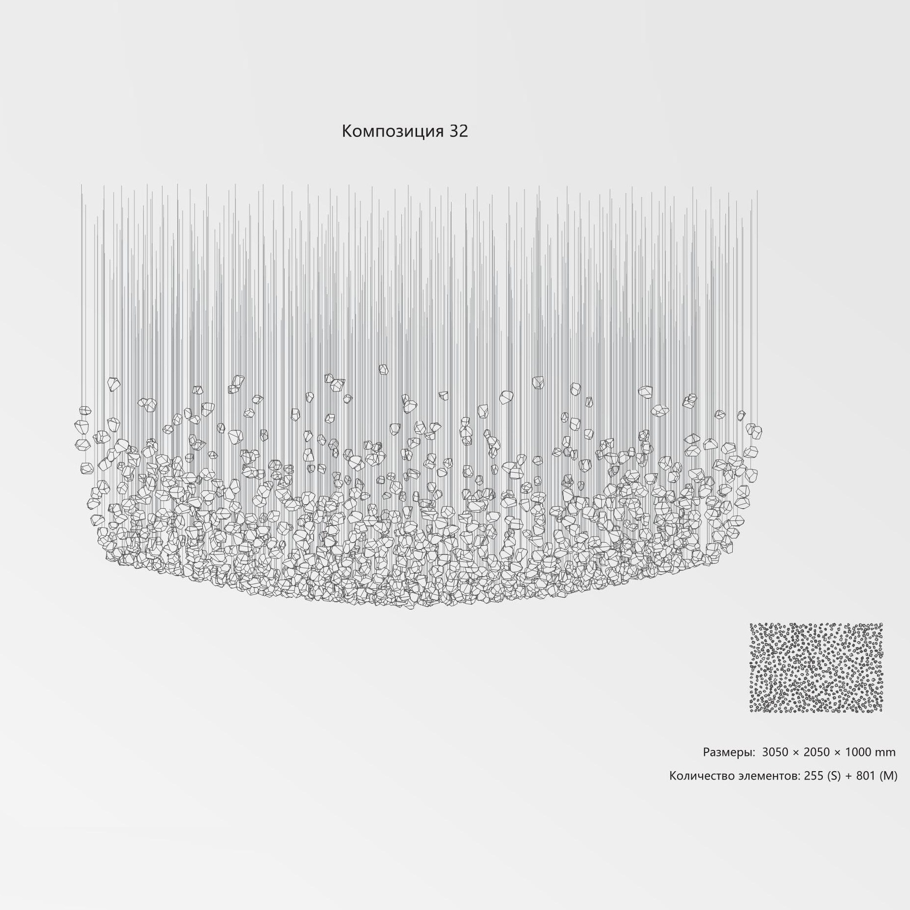 Конструкция представляет собой композицию из выразительных элементов, где каждый «камень» обладает уникальным рельефом и оптическими свойствами. Инсталляция доступна в трёх размерах элементов (S, M, L) и более чем в 35 готовых конфигурациях. Палитра включает классические прозрачные и дымчатые оттенки, а также насыщенные цветные варианты. При необходимости возможно создание индивидуального решения под конкретный проект.