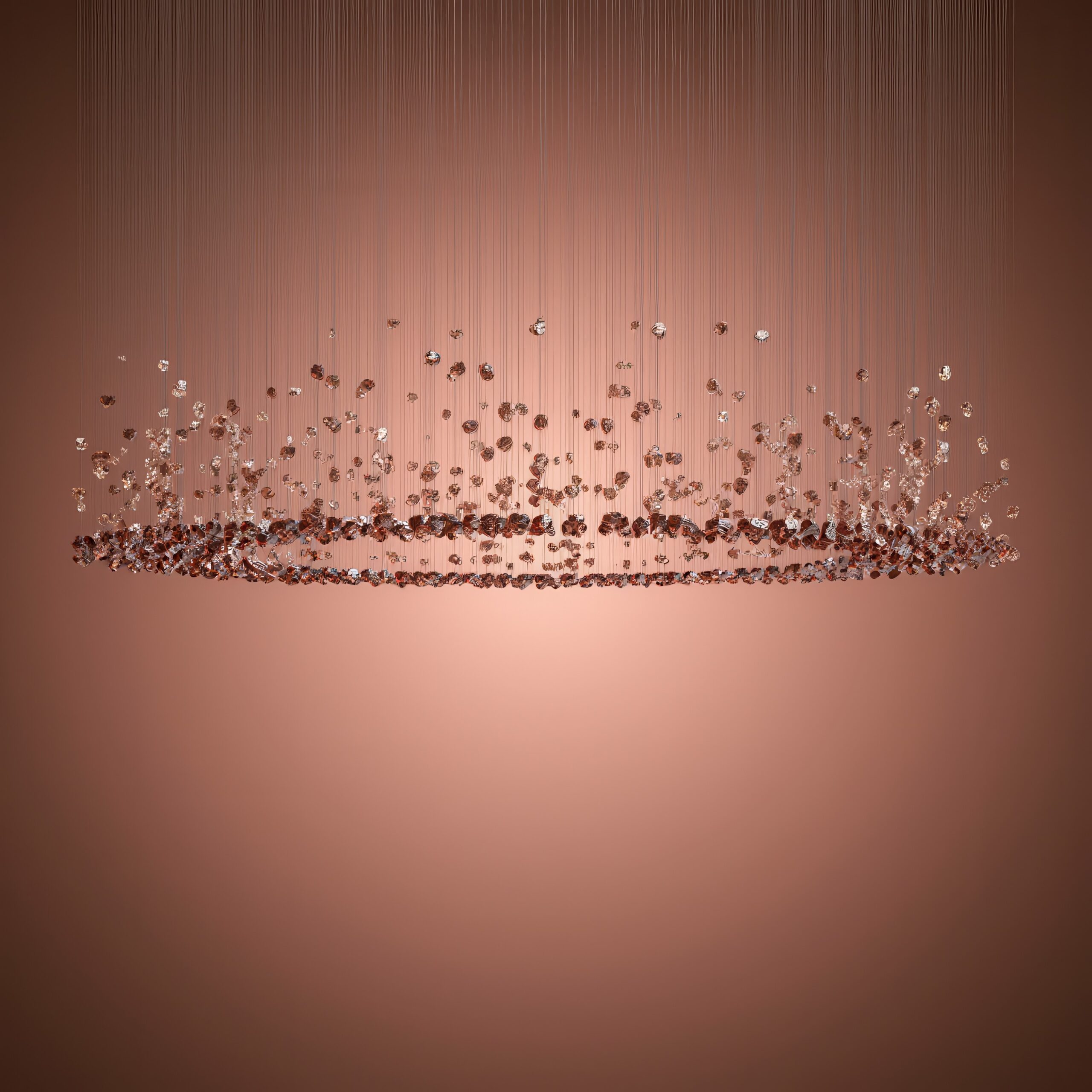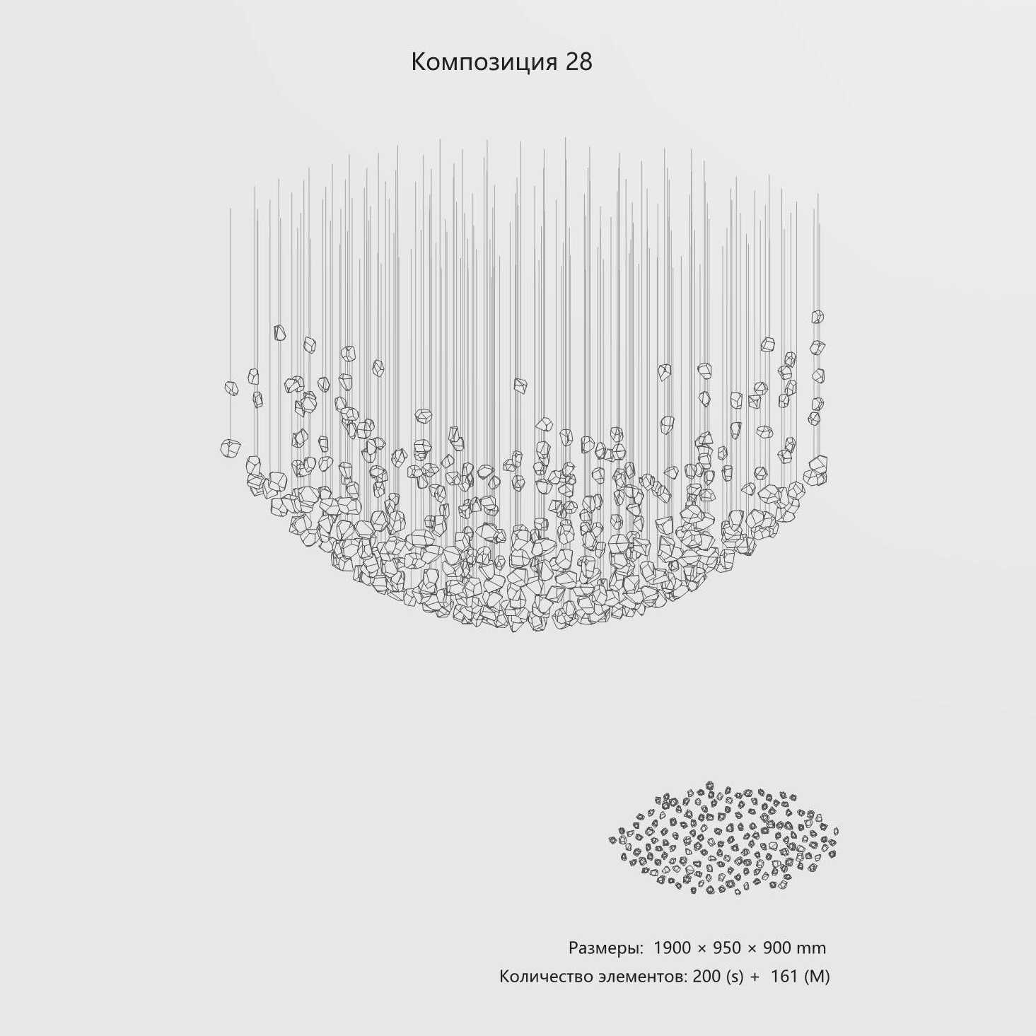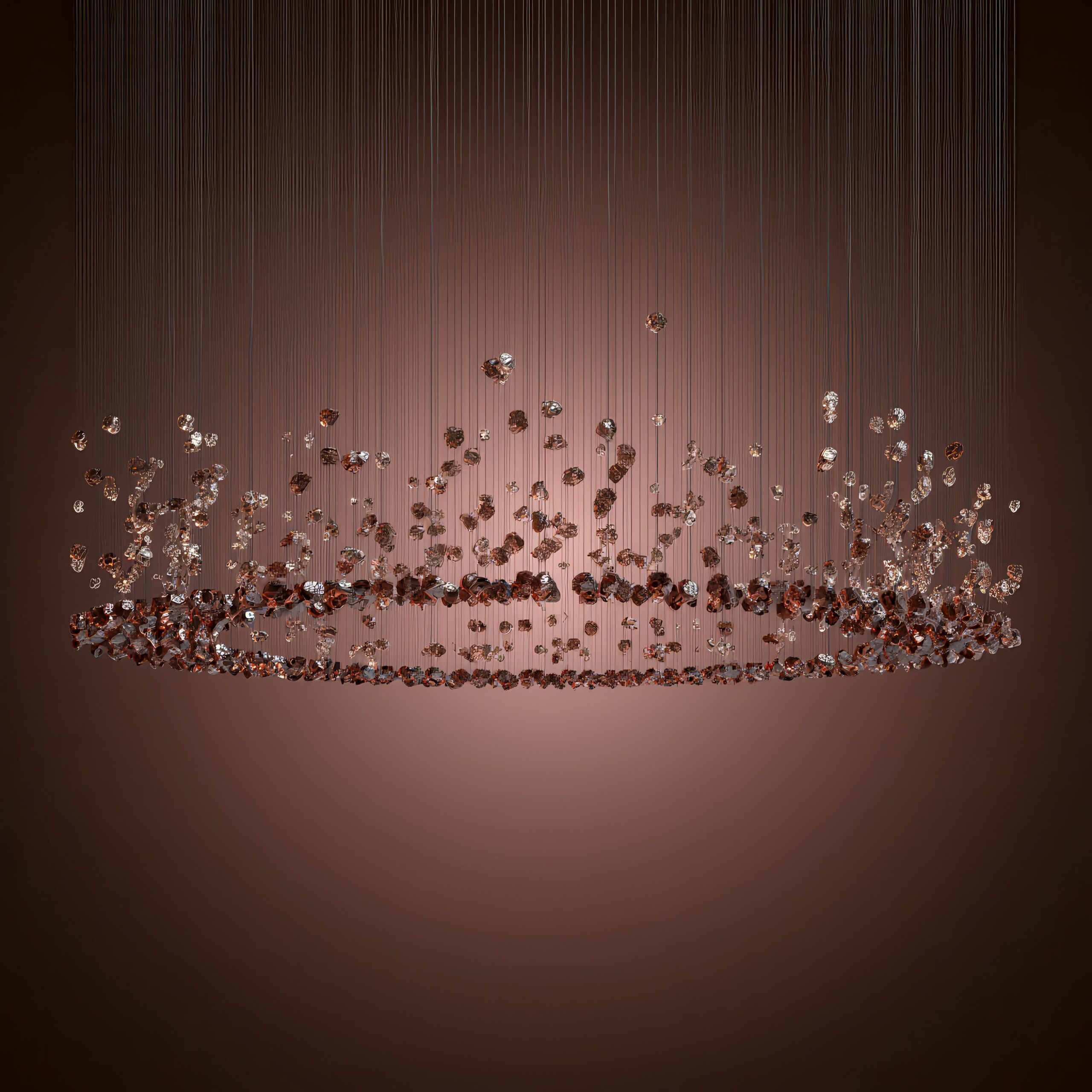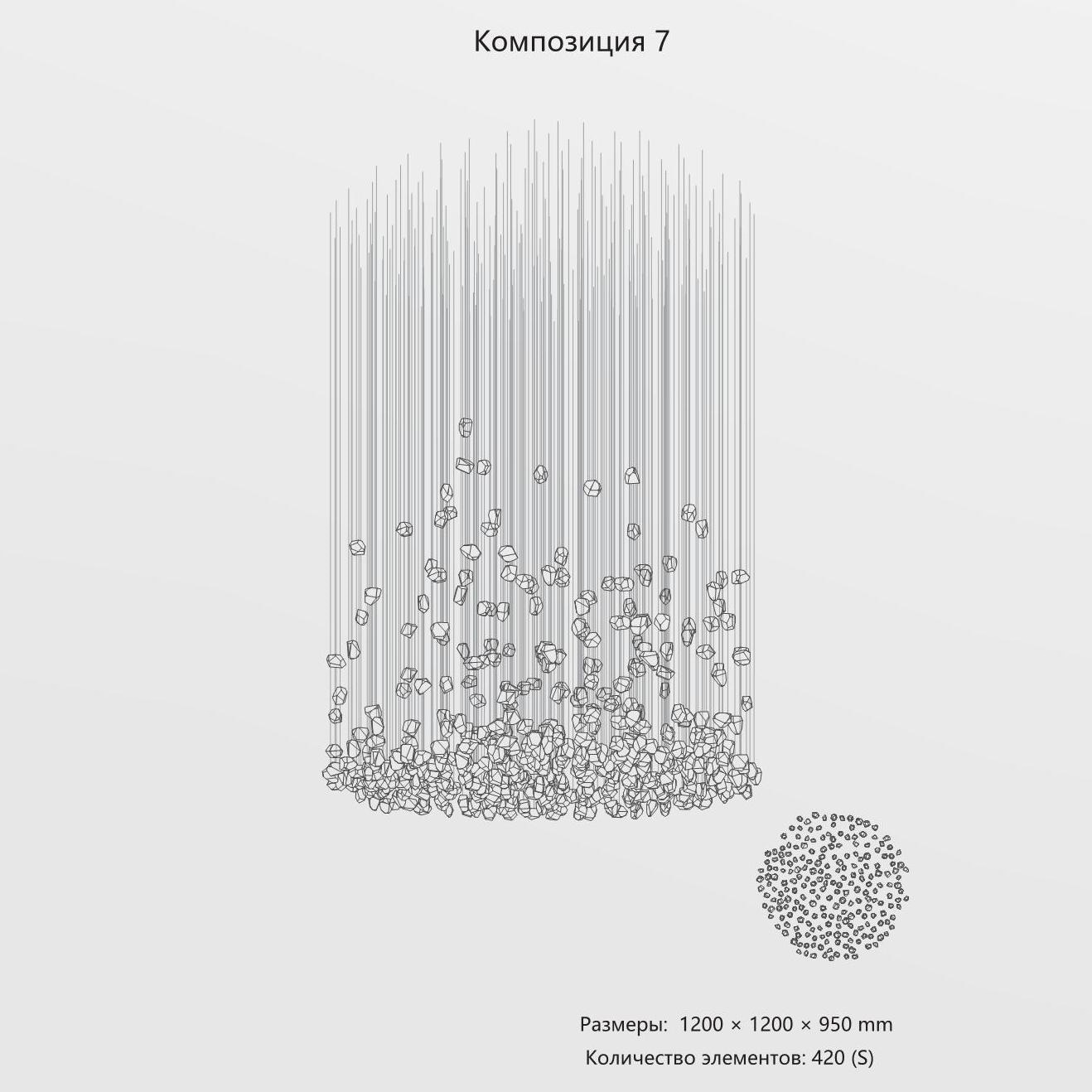 Эта подвесная инсталляция – мост между дикой природой и современным искусством. Массивные формы хрустального стекла с фактурой природного скола выглядят так, словно их только что извлекли из горных недр. Внутри каждого «кристалла» пробуждается свет, и преломляясь о грубые грани, создаёт мощное живое сияние. Это не просто свечение, а настоящая вспышка тысячи искр, игра глубинных бликов и переливов.