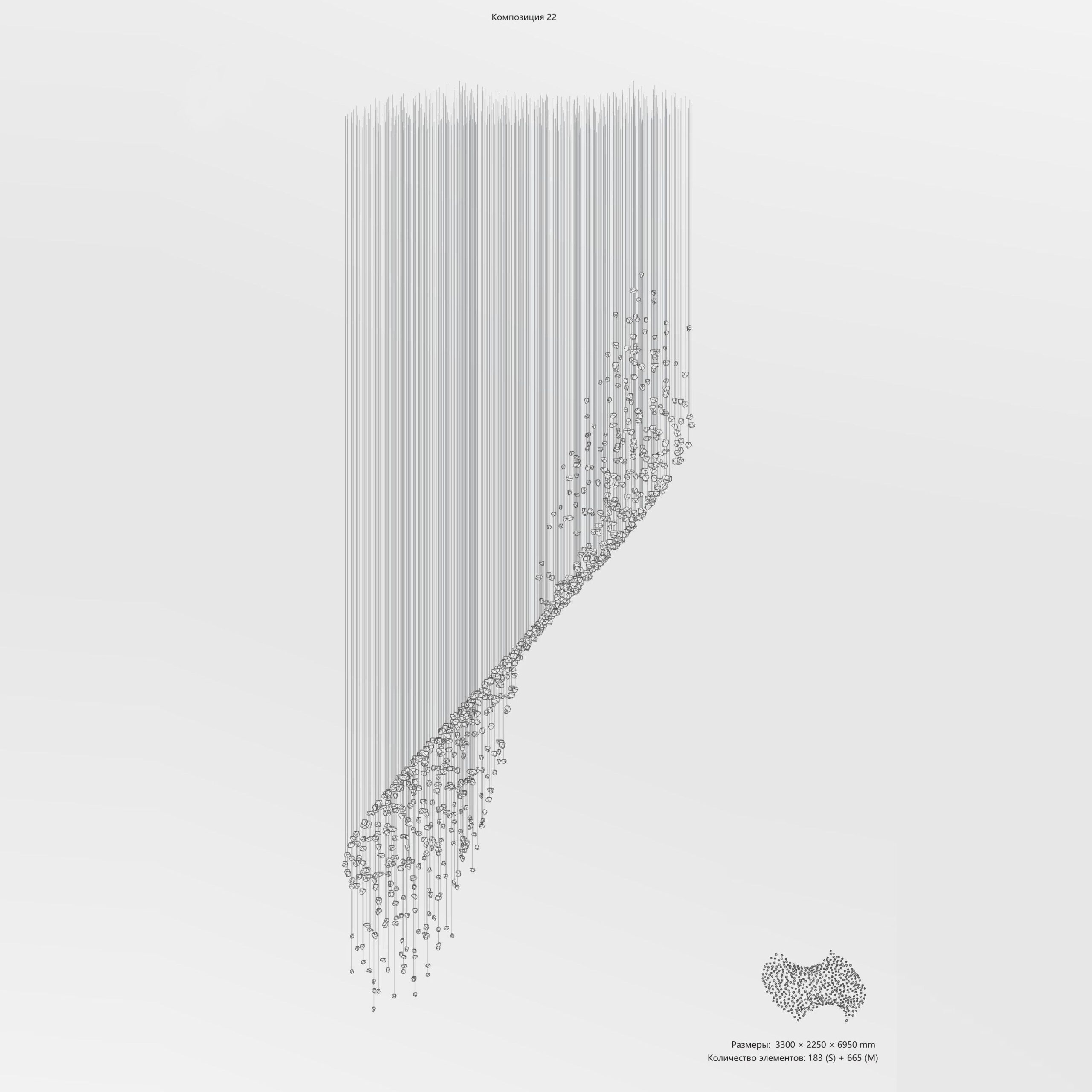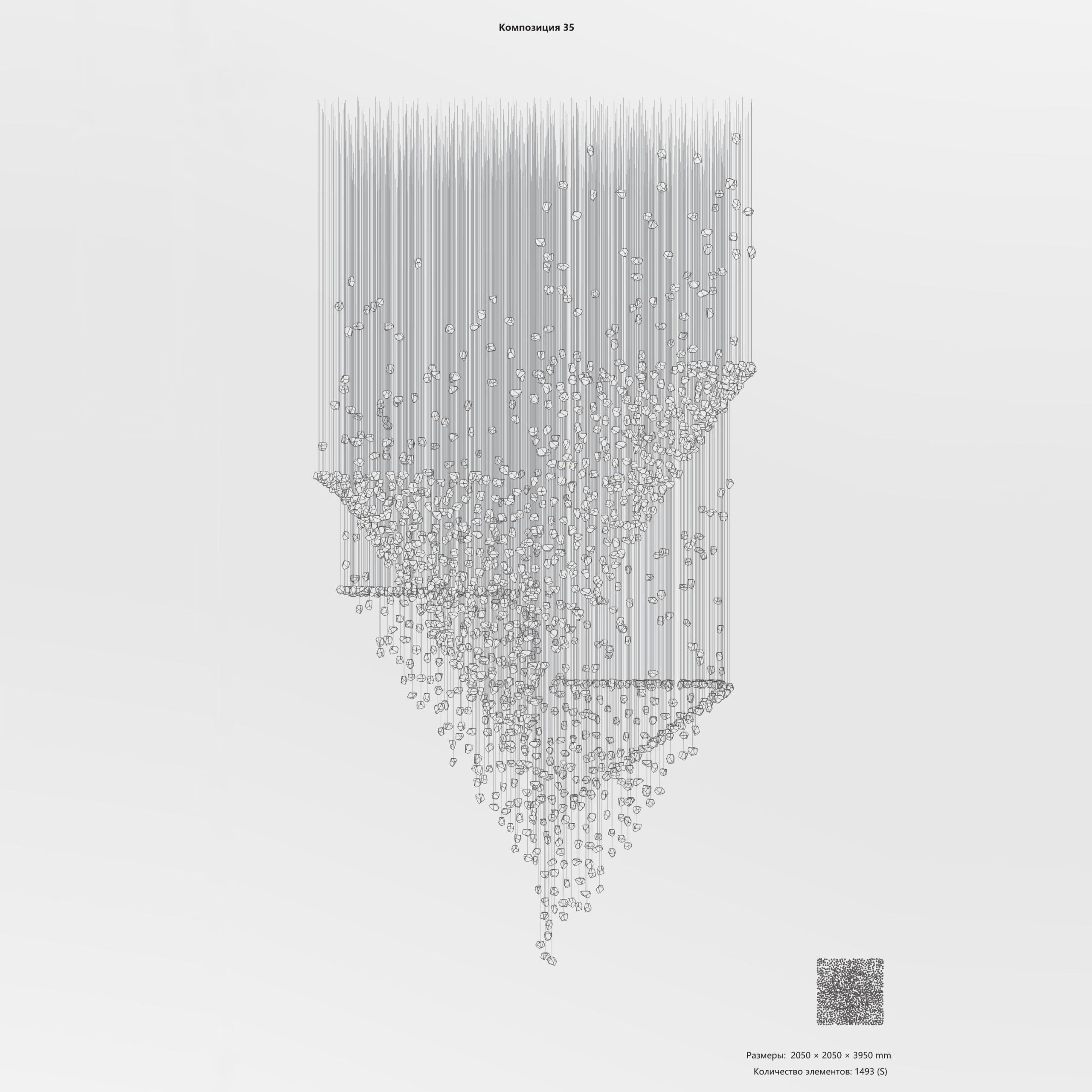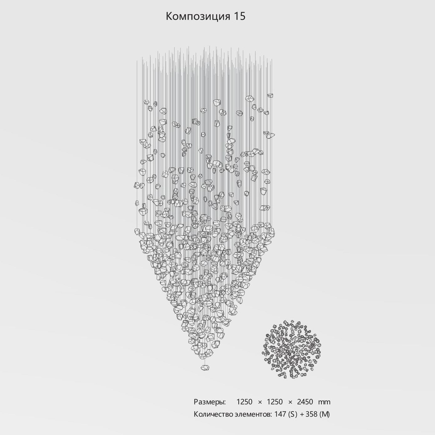 Эта подвесная инсталляция – мост между дикой природой и современным искусством. Массивные формы хрустального стекла с фактурой природного скола выглядят так, словно их только что извлекли из горных недр. Внутри каждого «кристалла» пробуждается свет, и преломляясь о грубые грани, создаёт мощное живое сияние. Это не просто свечение, а настоящая вспышка тысячи искр, игра глубинных бликов и переливов.