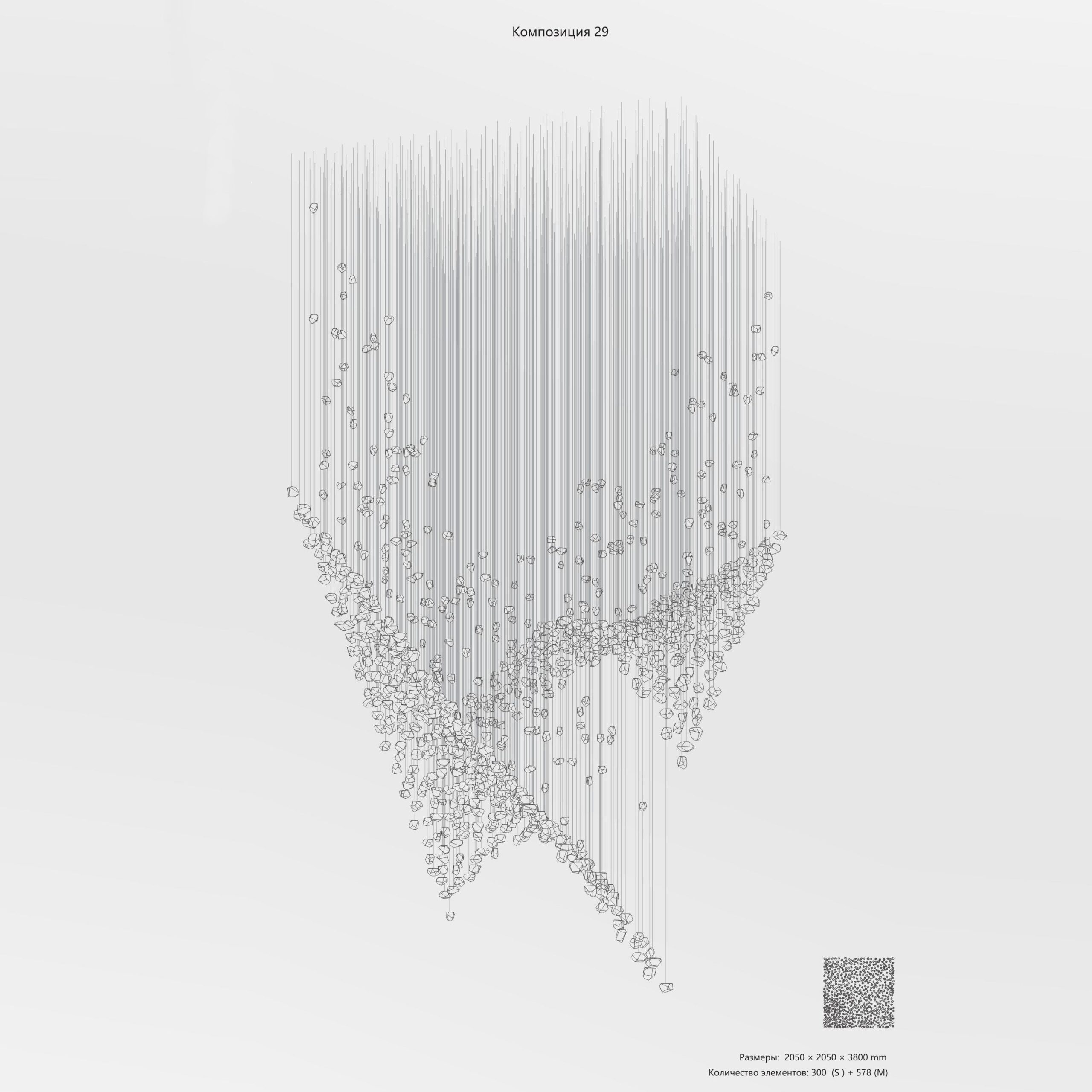 Конструкция представляет собой композицию из выразительных элементов, где каждый «камень» обладает уникальным рельефом и оптическими свойствами. Инсталляция доступна в трёх размерах элементов (S, M, L) и более чем в 35 готовых конфигурациях. Палитра включает классические прозрачные и дымчатые оттенки, а также насыщенные цветные варианты. При необходимости возможно создание индивидуального решения под конкретный проект.