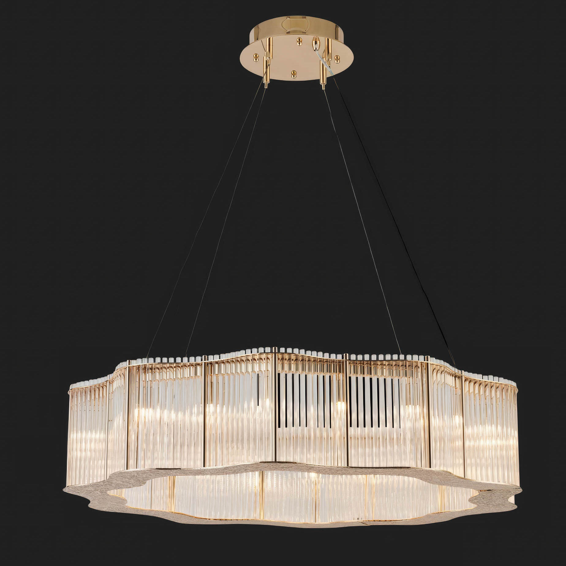 Абажуры изготовлены из множества вытянутых стеклянных трубок, закреплённых на металлическом каркасе с покрытием в цвете светлой платины. Тонкая структура создаёт ощущение воздушности, а гладкая поверхность стекла усиливает световые переливы.